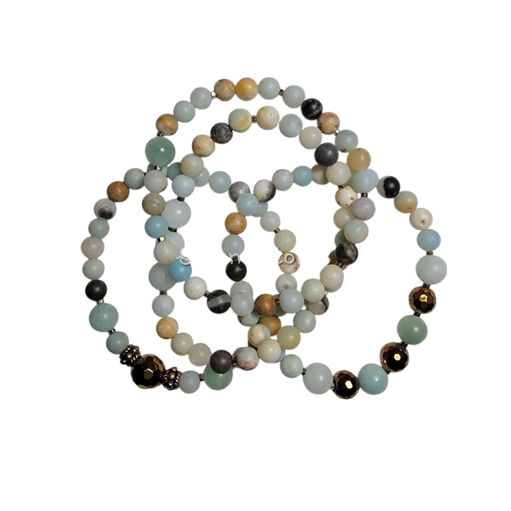 Introducing the Amazonite Skinny Stack, a unique combination of petite amazonite, bronze, and golden hematite. This stylish stack not only adds a touch of beauty to any outfit, but also brings potential benefits such as promoting balance and harmony. Get ready to elevate your accessory game with this playful and trendy stack.